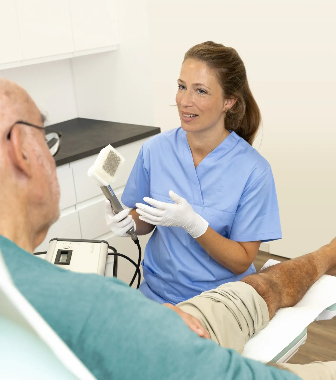 The treatment is standardised and safe: each area is treated in two 90-second intervals. This double application enhances the therapeutic effect. For larger wounds, the spacer is gradually overlapped until the entire area is completely covered.